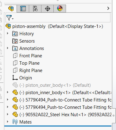 - Open up the subassembly that contains a rolled back component. In this example, the subassembly is titled “piston-assembly.”